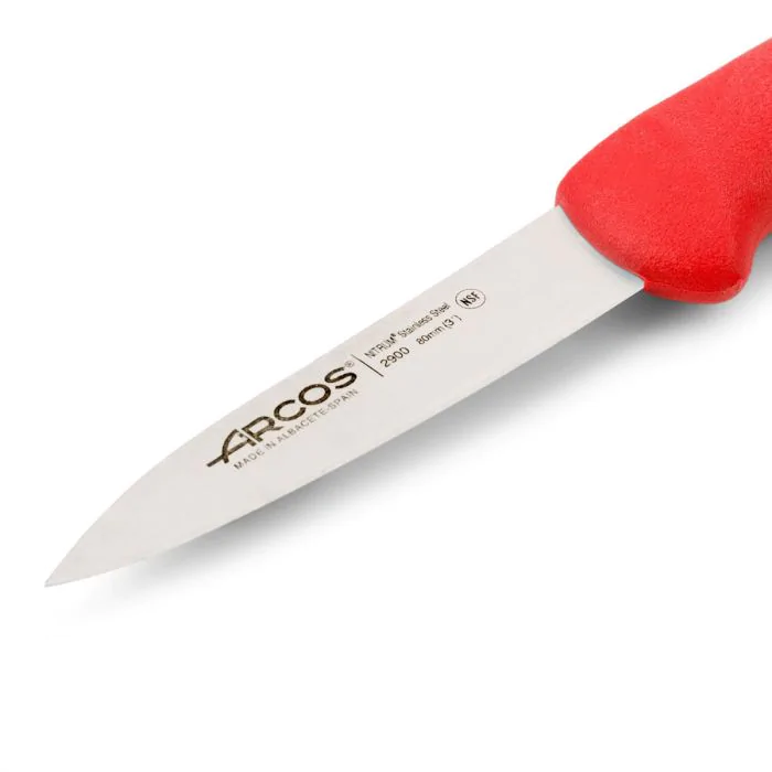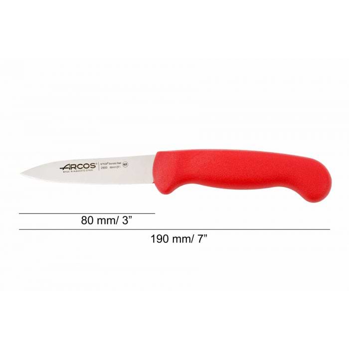 Introducing the 2900 Series 100 mm Red Paring Knife: small, light, and handy, with a central tip, perfect for chefs. Comes with a 10-year warranty against manufacturing defects. Manufactured by Arcos, Spain, since 1734. Features a serrated stainless steel blade measuring 100 mm.