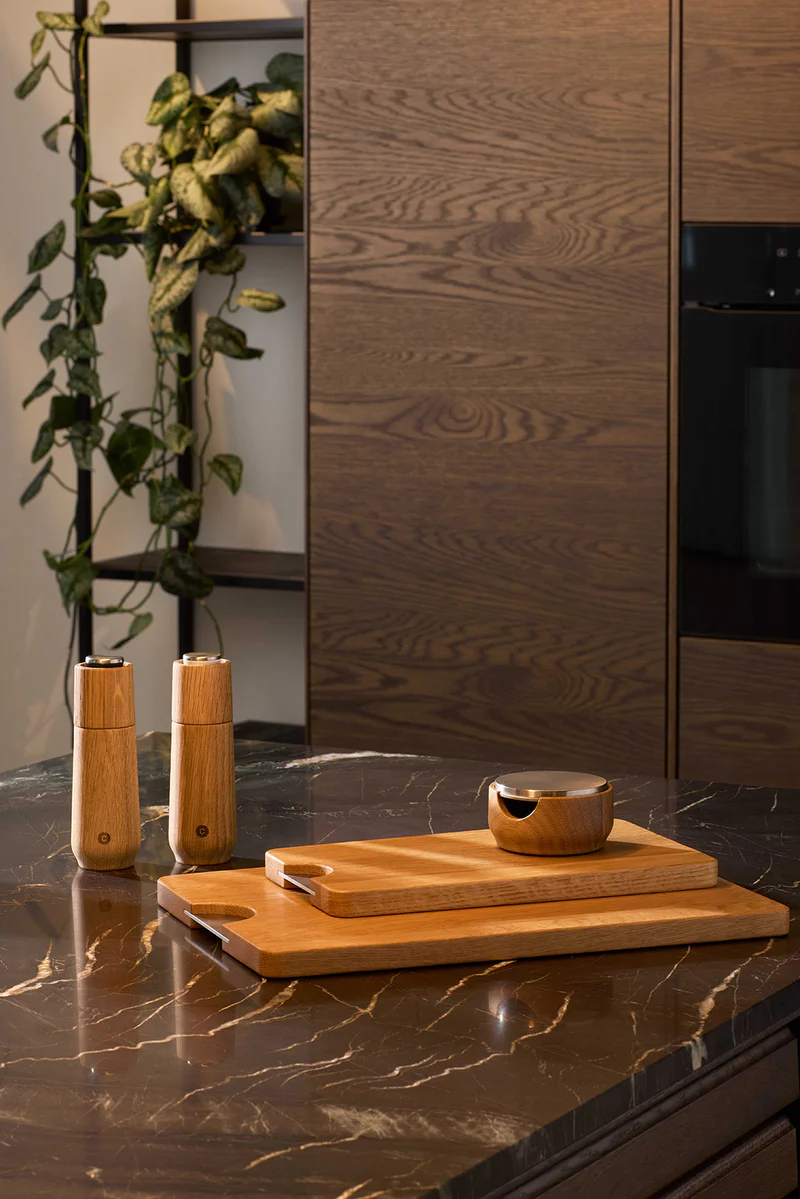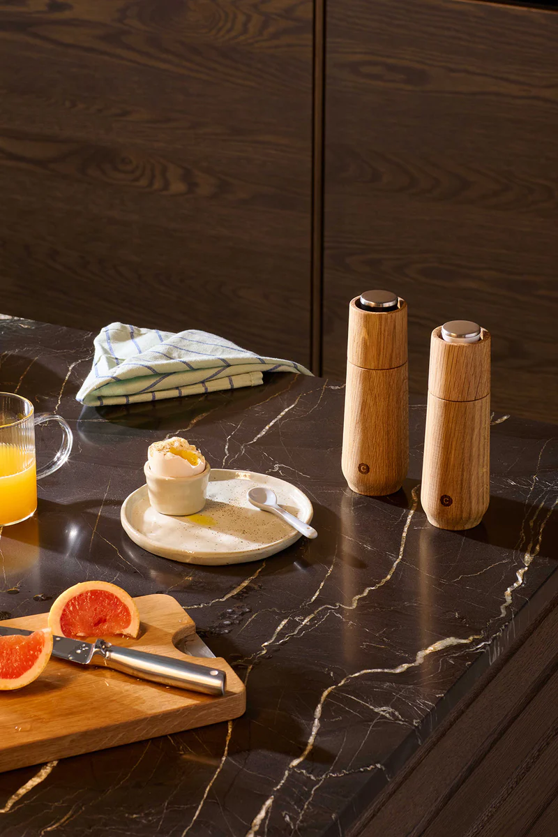Crafted from elegant FSC®-certified oak wood and paired with a striking mirror-polished steel top, these grinders are functional, fabulous, and unapologetically different. A cheeky black or white ring keeps things simple—salt or pepper, your choice.