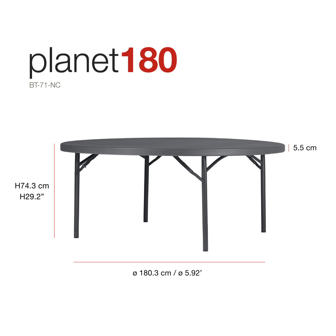 Round folding table Ø180cm for up to 10 people. Ideal table for banquets and celebrations. Table frame designed with no crossbars to ensure greater comfort for users. Its lightweight nature and the quality of the table top mean the table can be easily moved by rolling it without cracking. In combination with 4 XLMoon or XXLMoon tables, a table for up to 16 or 20 people can be created.