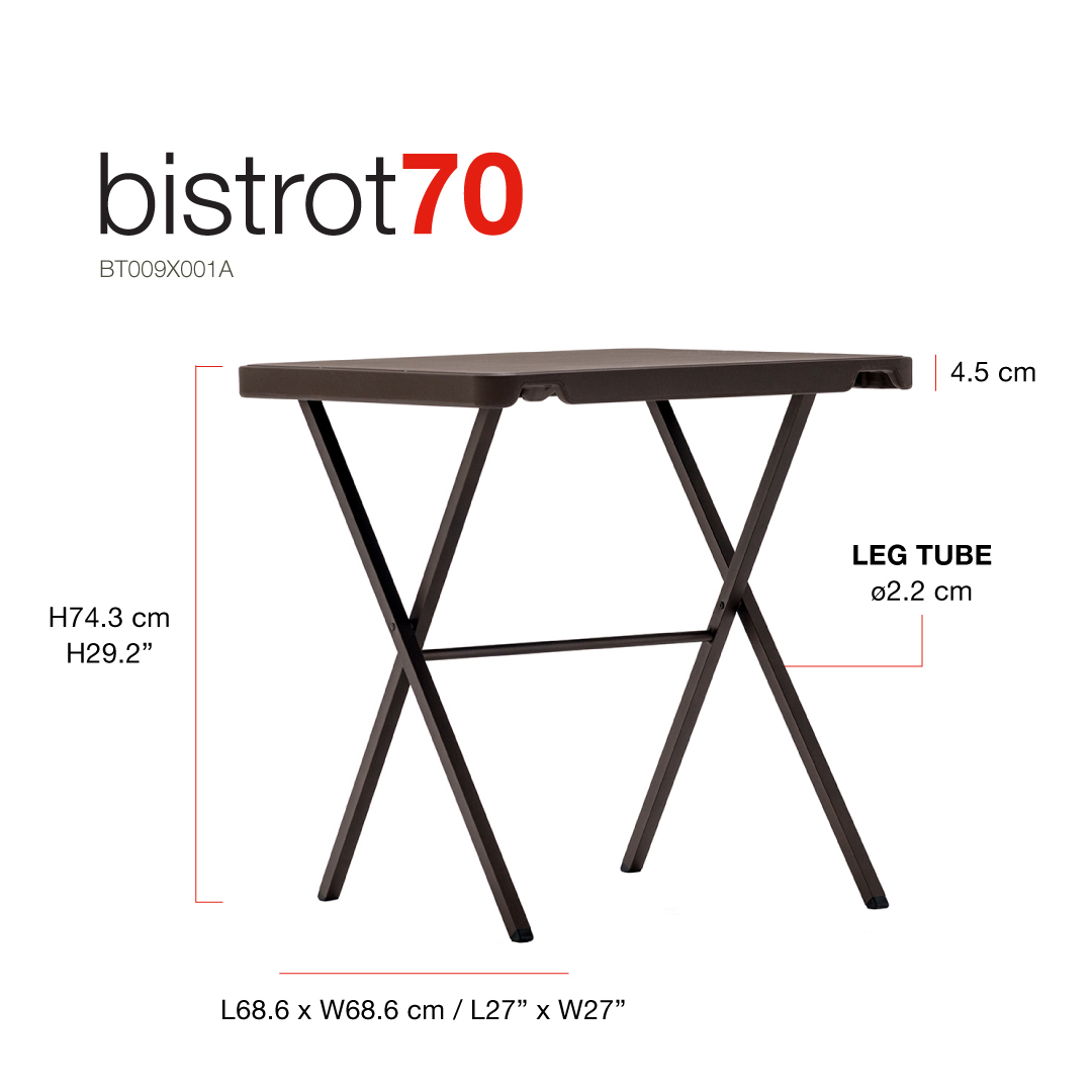 Bistrot table, 69 x 69 cm. Ideal for terraces that need to be cleared at night, thanks to its lightness, easy storage and minimal space requirements.